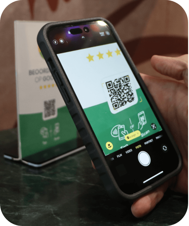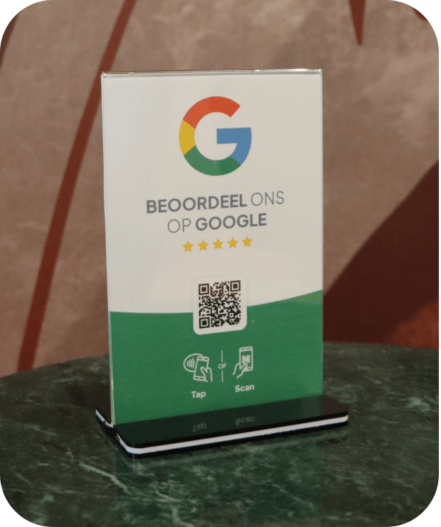 Onze Google Review display is te scannen via NFC en/of een QR-code. Wanneer een klant hun smartphone dicht bij het display houdt of de QR-code scant, wordt hij of zij direct doorgestuurd naar jouw Google Recensie-pagina. Dit maakt het voor klanten gemakkelijk en snel om een review achter te laten, zonder dat ze handmatig de URL hoeven in te voeren.