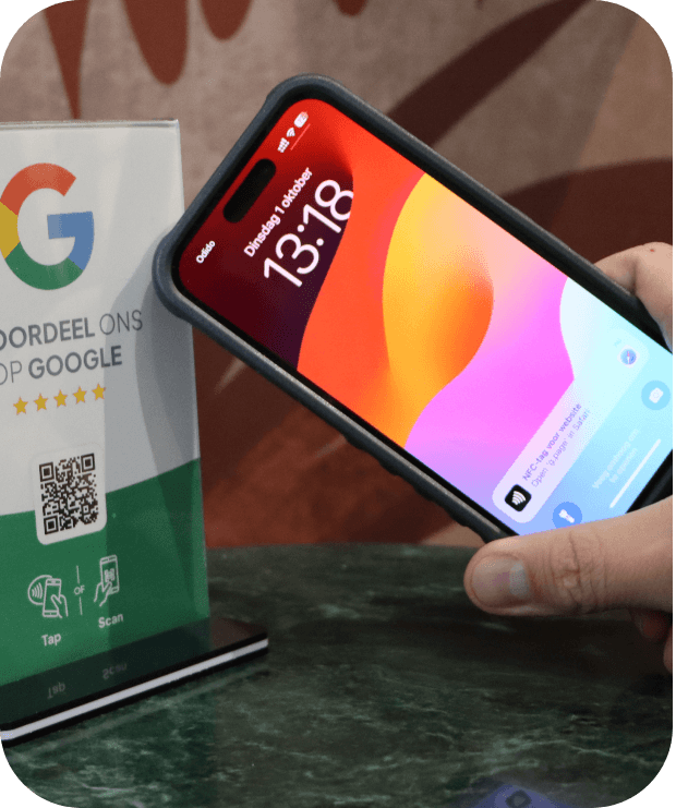 Ja, de Google Review display werkt op de meeste moderne smartphones. Near field communication wordt ondersteund door vrijwel alle Android-toestellen en iPhones. Voor oudere telefoons die geen NFC ondersteunen, biedt de display een QR-code als alternatief, zodat alle klanten toegang hebben tot de reviewpagina.